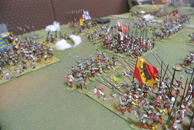 In the meantime Bart (after I told him, the double faced bastard that I am) lured Peter into the what I would call the gendarmes d‘Ordonnance trap. He attacked some nearly shaken gendarmes, failed and therefore had to retreated. But the as they are galloper (in my rules) they HAVE to charge into the pike block behind. Unfortunately Bart retreated with his doppelsoeldner through the block and disordered them as well, so the fight was then even again. I don't know how, but at some point I heard Peter calling me that his flank was about to disintegrate...