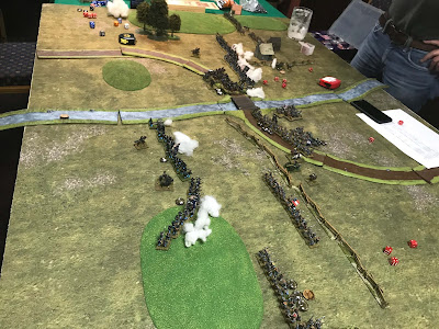 As there were some fences that would give a tiny bit of protection, we aimed to "run" to them in a bid to then out shoot the opponent. Peter lost due to shitty command dice and one blunder. But then my strategy (our only two cavalry units were on opposing sides of the river) - to cross the bridge with the cavalry, ended up in my units being repulsed.